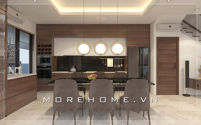 Thiết kế bàn ăn hiện đại mang tông màu veneer nâu sữa phù hợp với phong cách thiết kế của căn nhà.