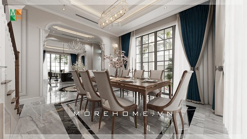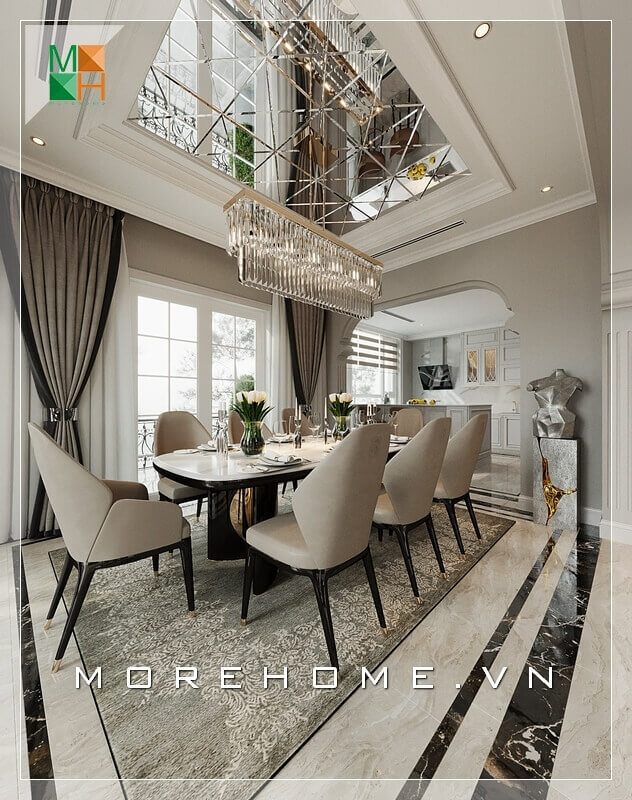 Tâm điểm của nội thất phòng ăn biệt thự, nhà phố là bộ bàn ghế ăn lớn bố trí theo kiểu hiện đại vừa sang trọng lại tiện nghi.