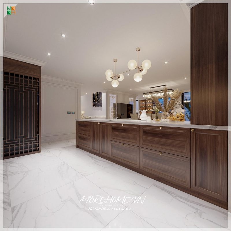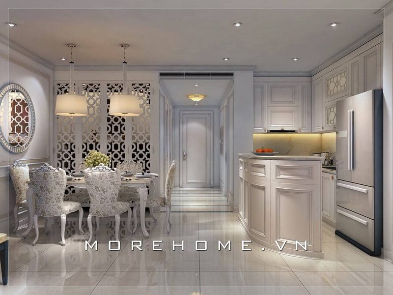 Thiết kế nội thất phòng bếp chung cư ấn tượng và sang trọng với lối thiết kế tân cổ điển nhẹ nhàng