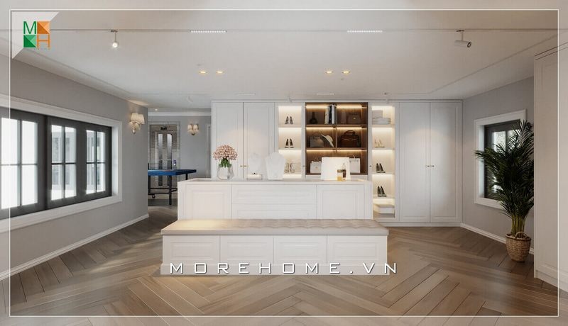 Thiết kế biệt thự có phòng để đồ sang trọng hiện đại, tủ gỗ kết hợp kính ấn tượng.