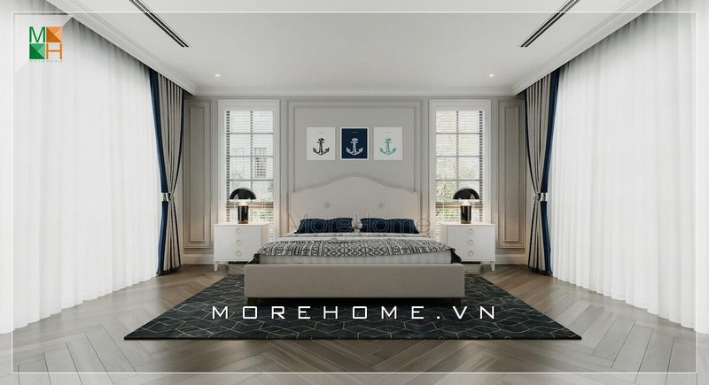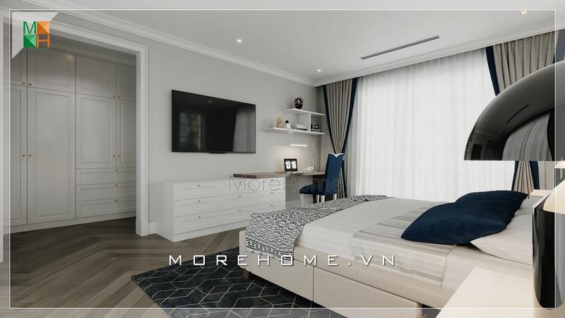 Thiết kế phòng ngủ có bố trí nội thất đơn giản, hiện đại không rườm rà cầu kì nhưng tiện lợi và sang trọng độc đáo cho không gian biệt thự, nhà phố.