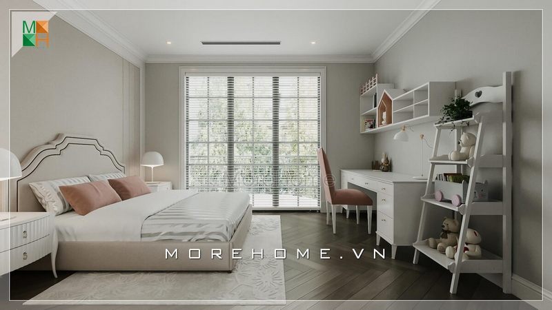Thiết kế nội thất phòng ngủ hiện đại dành cho bé gái đẹp cao cấp, tiện lợi hài hòa từ mẫu giường ngủ bọc da đến hệ thống tủ kệ tiện lợi.