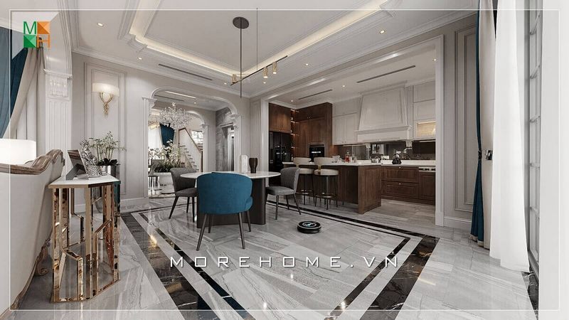 Vừa mang vẻ đẹp thoáng đãng vừa sang trọng khi bố trí phòng ăn liền phòng bếp trong một không gian rộng kết hợp sử dụng nội thất cao cấp xứng đáng là lựa chọn của gia chủ trong thiết kế nhà phố