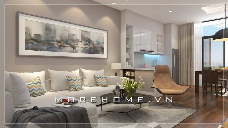 Trang trí nội thất căn hộ chung cư bố trí phòng khách liền phòng bếp ăn sử dụng màu trắng chủ đạo tạo vẻ đẹp tinh tế