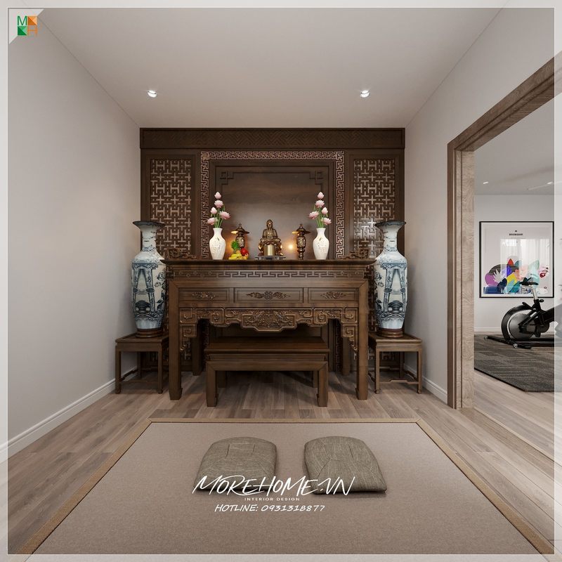 Bộ bàn thờ gỗ có màu nâu trầm ấm khi đặt trong không gian sẽ tạo nên một cảm giác ấm cúng cho căn phòng thờ.