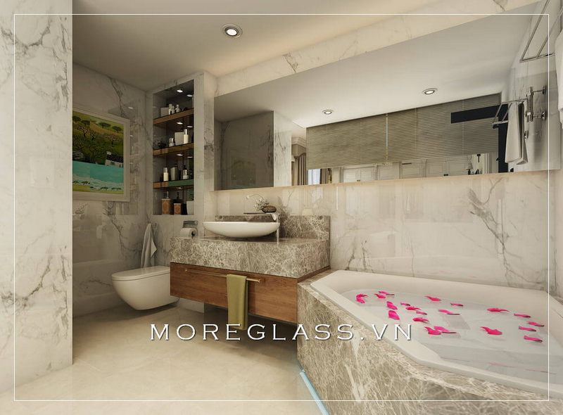 Mẫu thiết kế phòng tắm sang chảnh của nhà biệt thự cao cấp đã cuốn hút nhờ cách bố trí nội thất và không gian hợp lí, tạo nên một không gian thư giãn tuyệt vời cho gia chủ.
