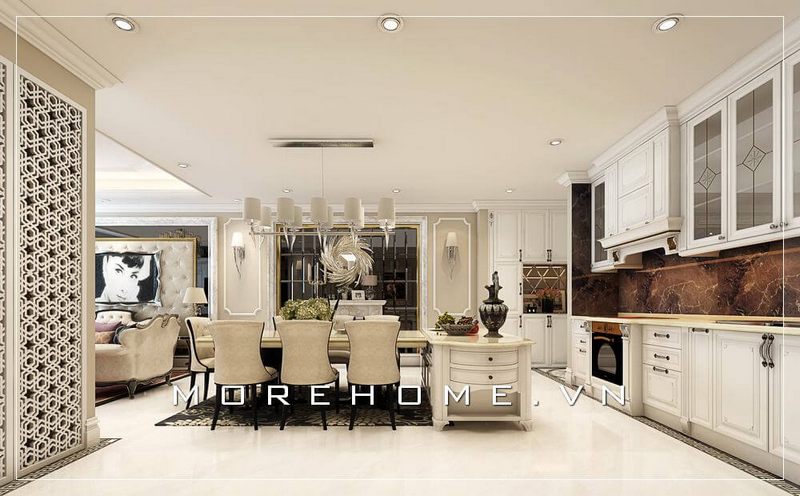 Mẫu tủ bếp màu trắng nhẹ nhàng, tinh tế sẽ làm cho không gian phòng bếp biệt thự trở nên hài hòa và sang trọng hơn.