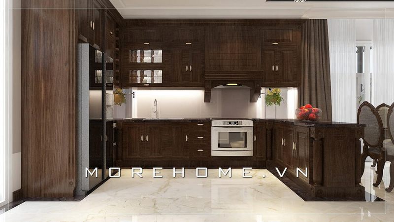 của bạn Mẫu tủ bếp gỗ tự nhiên với kiểu dáng chữ U tân cổ điển, sử dụng tone màu nâu trầm để tạo nên cảm giác ấm cúng, sang trọng và tiện nghi cho phòng bếp biệt thự của bạn.