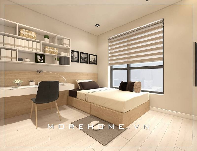 Bàn làm việc gỗ công nghiệp được thiết kế liền kề với giường ngủ, gia chủ có thể làm việc và nghỉ ngơi thoải mái, nhanh chóng hơn
